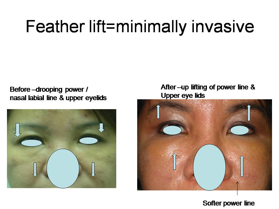 Mini face lift by feather threads ,is lift for drooping cheek,mouth's angle,face,jowl,neck ,angle of eyes,and forehead.It is minimally invasive,low downtime,with good result,lasting,effective and safe,proven track record,board certified.