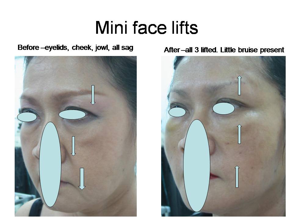 Mini face lift by : feather lift , life style lift, is face lift for drooping cheek,mouth's angle,face,jowl,neck angle of eye ,forehead.